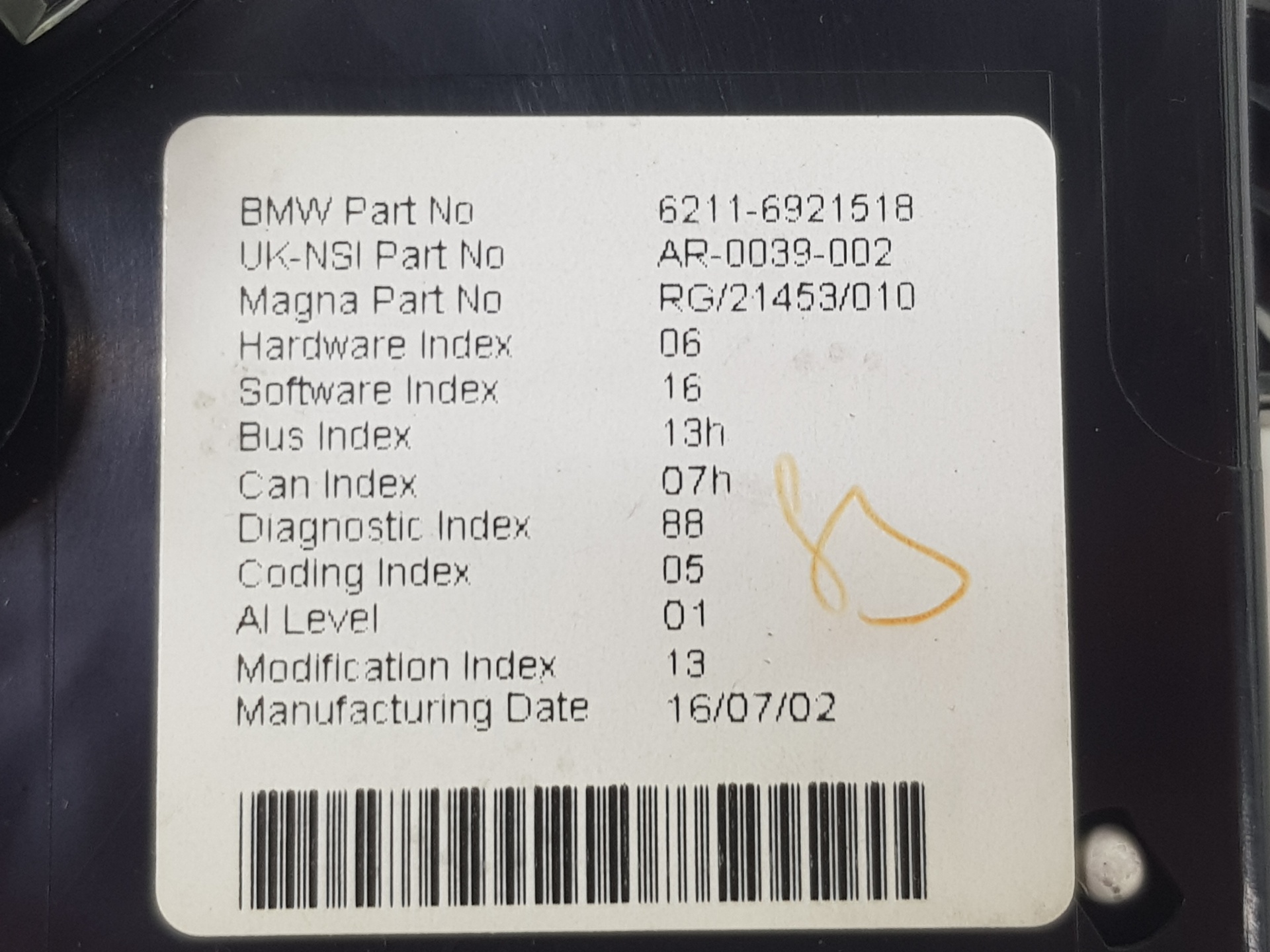 | Osservazioni | VELOCIMETRO 62116921518 6921518 62116978319 62116957298 62116936283 62116924908 AR0039002 |